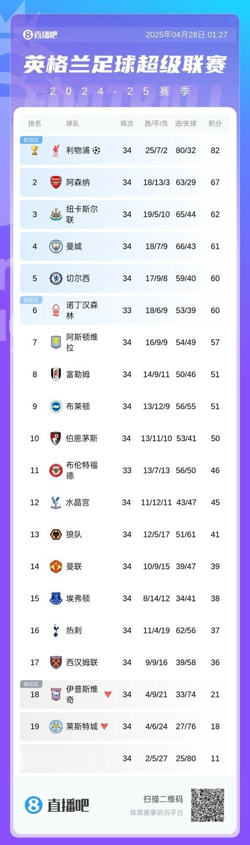 直播吧04月28日讯 英超第34轮,利物浦5-1大胜热刺,提前4轮锁定本赛季英超冠军,而目前位居积分榜第二的阿森纳领先身后5分。